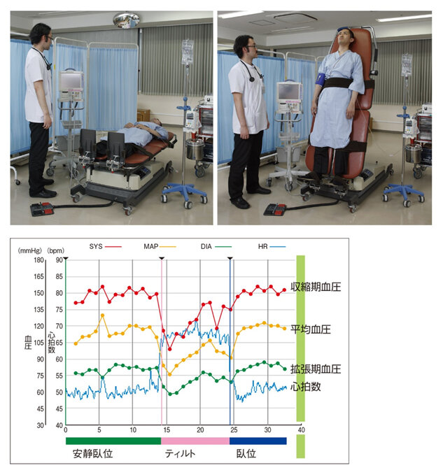 自律神経性を介する反射性失神(神経調節性失神・血管迷走神経性失神)を再現する検査です。傾斜のかかるベッドを用いて検査を行います。薬剤を使用し失神が起こりやすい状況を作る場合もあります。高齢な方や危険性が高い患者様は入院で行います。